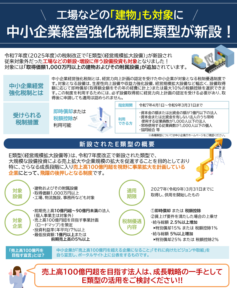 売上高100億円超を目指す法人は、 成長戦略の一手としてE類型の活用をご検討ください!!