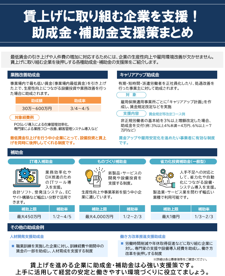 賃上げを進める企業に助成金・補助金は心強い支援策です。 上手に活用して経営の安定と働きやすい環境づくりに役立てましょう。