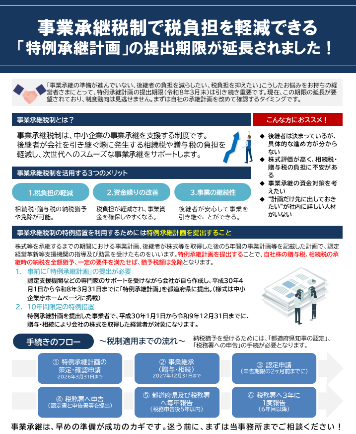 特例承継計画の提出期限(令和8年3月末)は引き続き重要です。